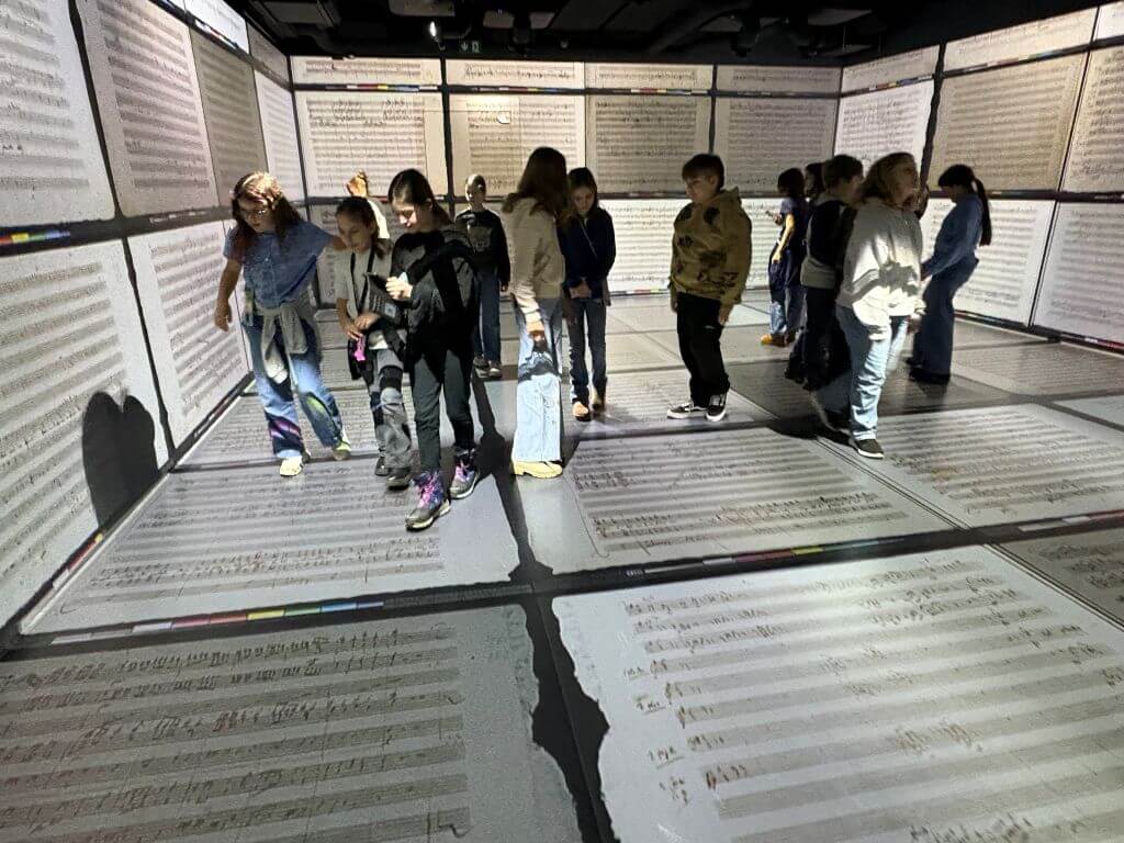 Auch im interaktiven Raum zur „Eine kleine Nachtmusik“ hatten die Schülerinnen und Schüler viel Spaß: Sie durften selbst Instrumente ausprobieren und gemeinsam Musik machen. Durch Licht, Klang und moderne Technik bekamen sie einen spannenden Einblick in Mozarts Leben und seine kreative Welt.
